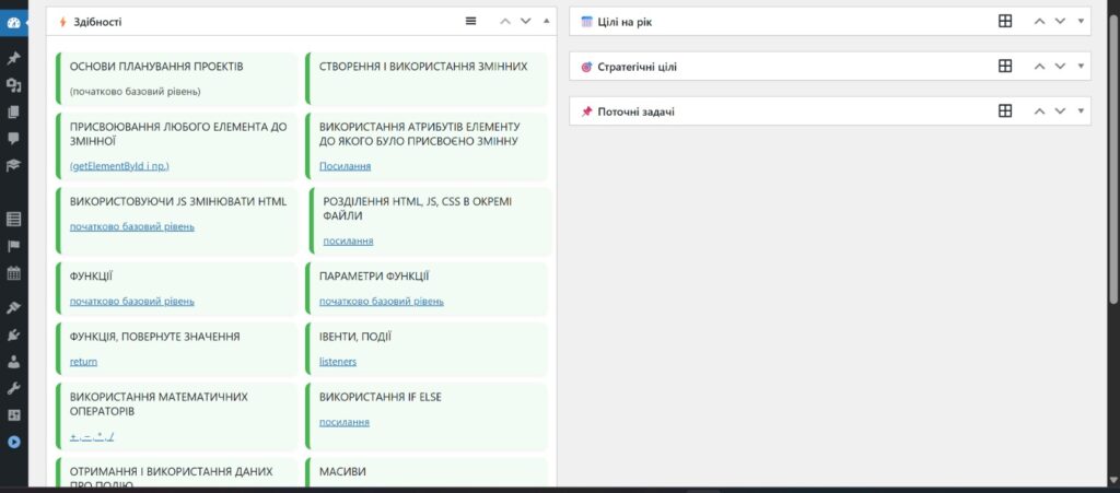 Більш того, окрім здібностей і дерева навичок, планувалось розмістити дошки з цілями. Поточні цілі, стратегічні цілі, цілі на рік. А також зробити можливість вести щоденник (ну для цього WordPress просто ідеально підходить). Ось як виглядав первісний план: